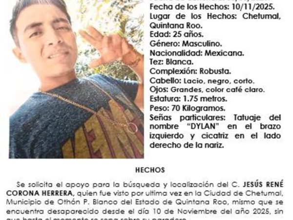 5 Mar. 2026 Redacción / CAMBIO 22 Playa del Carmen, Quintana Roo, 5 de marzo de 2026.— El gobierno municipal que encabeza la presidenta Estefanía Mercado continúa…Fiscalía Activa Búsqueda para Localizar a Jesús René Corona Herrera en Chetumal