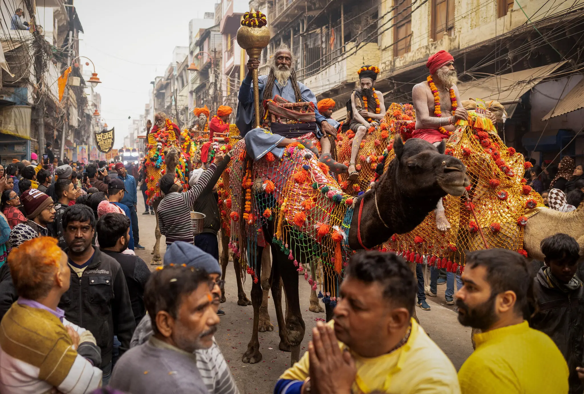 Los baños sagrados van precedidos de procesiones en las que la gente canta y baila con atuendos llamativos, en carros ornamentados y blandiendo lanzas, tridentes y espadas ceremoniales. Para participar, la gente viaja desde toda India y el mundo hasta la confluencia de los ríos Ganges y Yamuna, un lugar sagrado que también se dice que es el punto final de un tercer río mítico, el Saraswati.