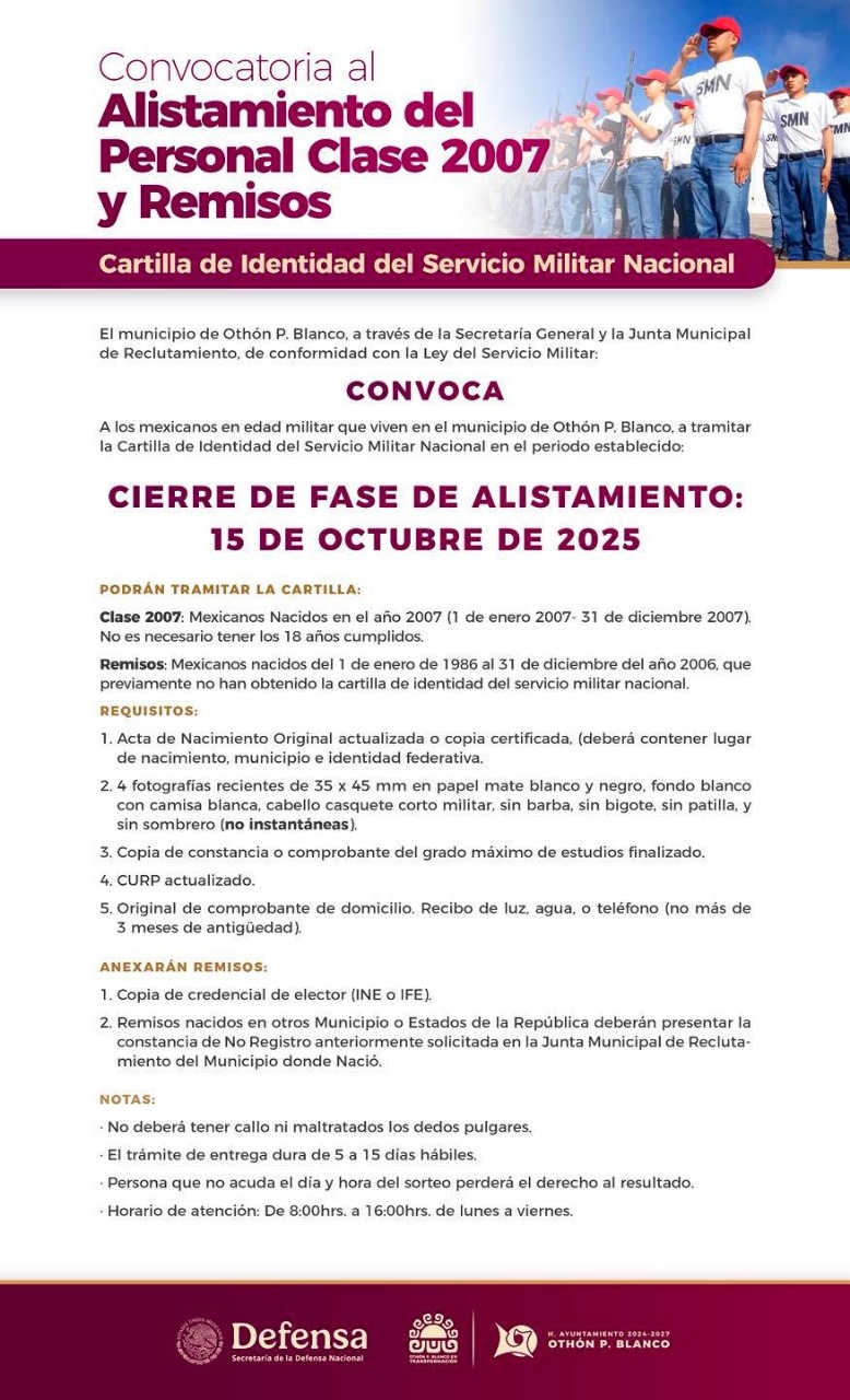 CHETUMAL, 30 de septiembre. – El tiempo se agota para los jóvenes quintanarroenses de la Clase 2007 y remisos que aún no han tramitado su Cartilla de Identidad del Servicio Militar Nacional. El Ayuntamiento de Othón P. Blanco, a través de la Secretaría General y la Junta Municipal de Reclutamiento, recordó que el 15 de octubre de 2025 vence el plazo para registrarse, lo que deja apenas dos semanas para cumplir con este deber cívico.