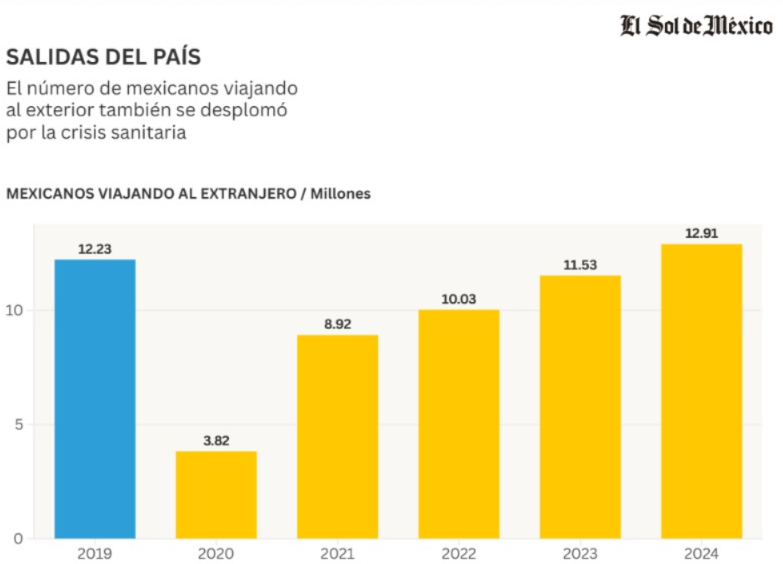 Por otra parte, datos del Instituto Nacional de Estadística y Geografía (Inegi) muestran que el número de connacionales que viajaron al extranjero el año pasado ya superó lo registrado en 2019.
