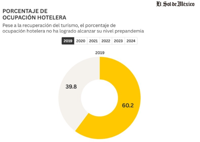 Cifras de Datatur, el portal de estadística de la Secretaría de Turismo (Sectur), muestran que el porcentaje de ocupación hotelera en el país cerró el año pasado apenas un punto porcentual por debajo de lo registrado el año previo a la pandemia.