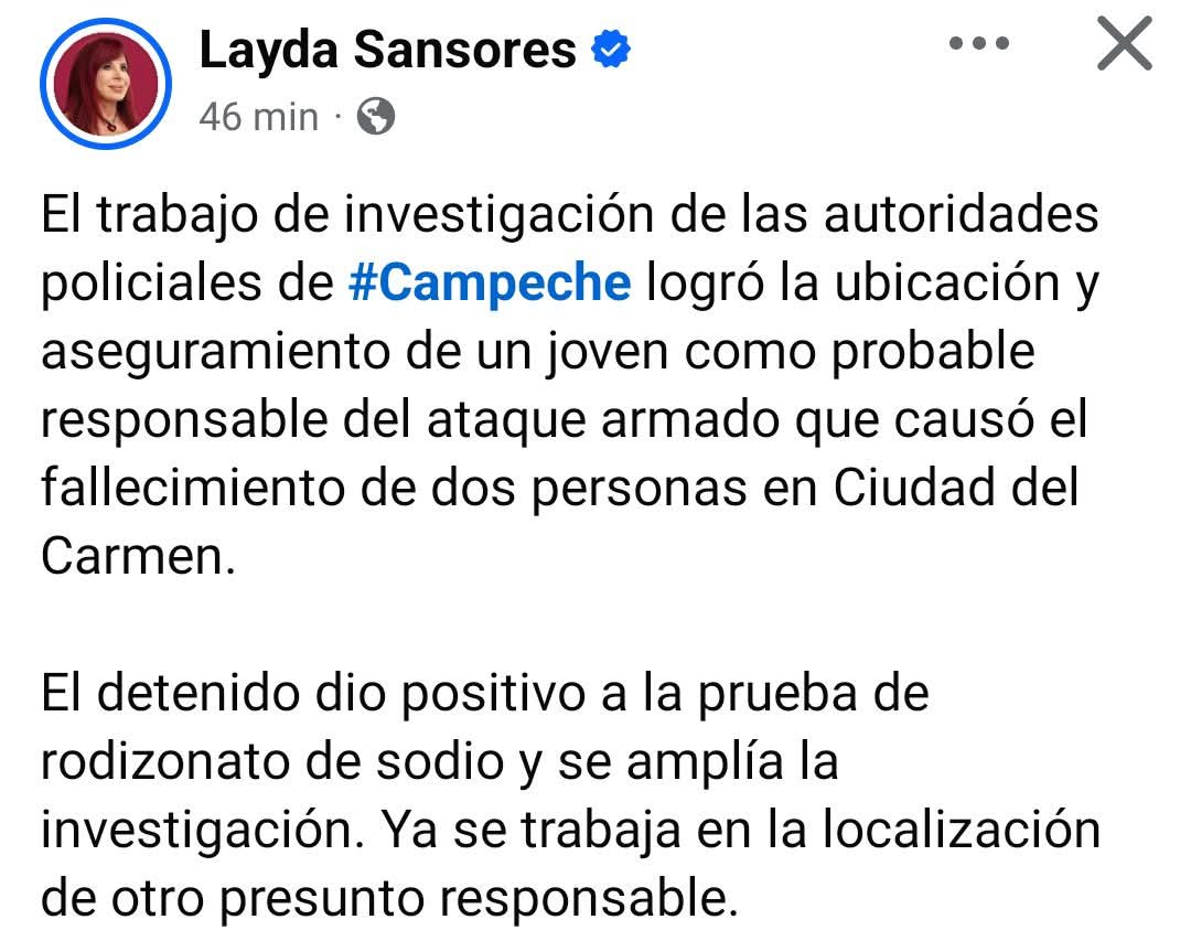 Fue la misma mandataria estatal de Campeche, Layda Elena Sansores San Román, quien confirmó la detención del sujeto, además de informar que resultó positivo en la prueba de rodizonato de sodio.