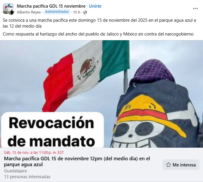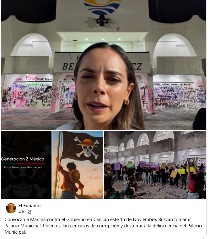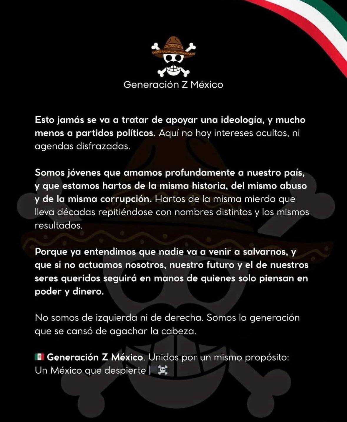 En Ciudad de México, jóvenes de la denominada Generación Z convocaron a una manifestación nacional para el sábado 15 de noviembre, con respaldo de diversos colectivos estudiantiles, el punto de encuentro anunciado es el emblemático Ángel de la Independencia, desde donde marcharán hacia la plancha del Zócalo, los organizadores han invitado a los participantes a portar banderas con símbolos poco convencionales, la icónica Jolly Roger del anime One Piece, emblema de la tripulación del personaje Monkey D. Luffy.