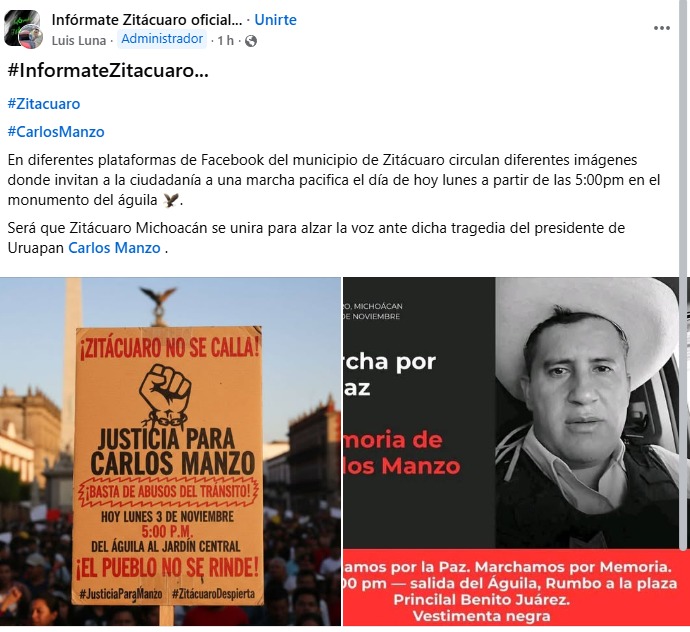 En Zamora, por ejemplo, ciudadanos invitan a reunirse el 15 de noviembre “para exigir justicia y paz” en memoria del edil uruapense.