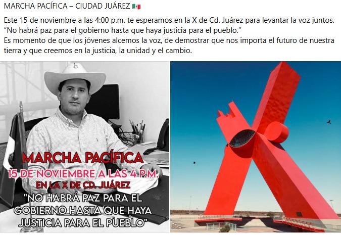 En Ciudad Juárez, a través de Facebook y WhatsApp comenzó a circular un cartel invitando a una marcha pacífica el 15 de noviembre a las 16:00 horas, teniendo como punto de reunión el monumento conocido como “La X”.