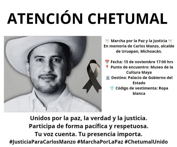 Varias ciudades michoacanas convocan nuevas marchas para honrar a Manzo y exigir justicia, en Uruapan (donde ocurrió el crimen), en la capital Morelia, así como en municipios del oriente como Zitácuaro y del occidente como Zamora.