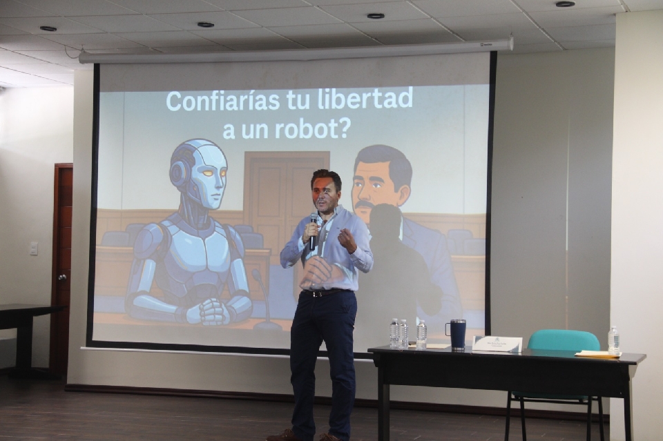La jornada académica abrió con la conferencia “Retos del Derecho en la era digital: Inteligencia Artificial” a cargo del Mtro. Harley Sosa Guillén. En ella, se planteó que es posible —y cada vez más probable— que, en el corto plazo, una máquina asuma el rol de defensor jurídico ante un tribunal, lo que obliga a repensar desde las bases los programas formativos de las universidades.