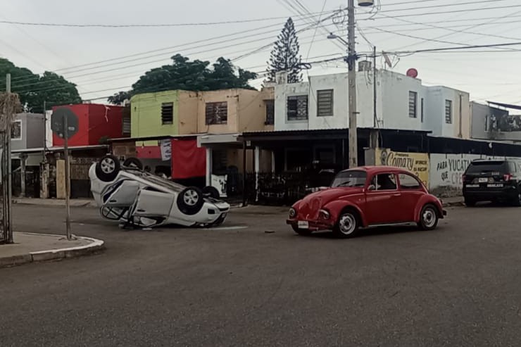 MÉRIDA, YUC.- 19 de junio.- Llantas arriba quedó un auto March en calles del fraccionamiento Vergel 3, al oriente de Mérida, tras ser embestido por un pequeño, pero poderoso Volchito. En el primer auto sufrió golpes leves la guiadora, quien fue la responsable del accidente.