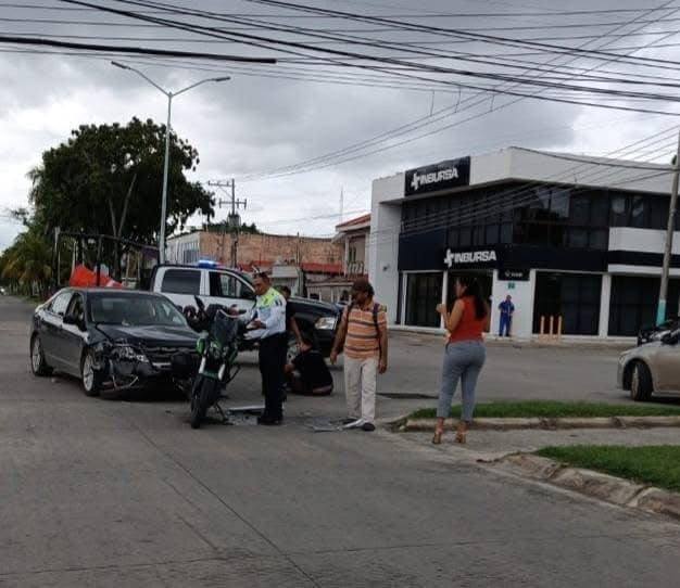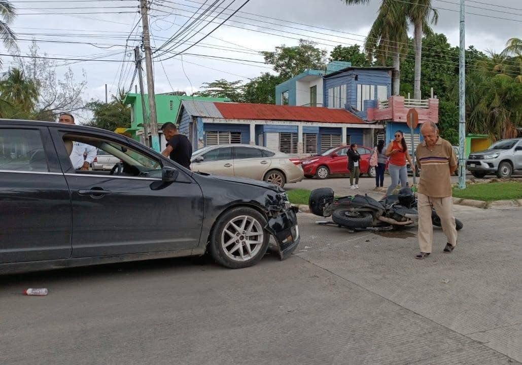 CHETUMAL, 9 de enero.- Un accidente vehicular ocurrió en el cruce de la avenida Hidalgo y la calle Carmen Ochoa, cuando el conductor de un automóvil particular no respetó un alto marcado por disco. Al invadir la vía, provocó que un motociclista que transitaba por la avenida Hidalgo impactara contra su vehículo.