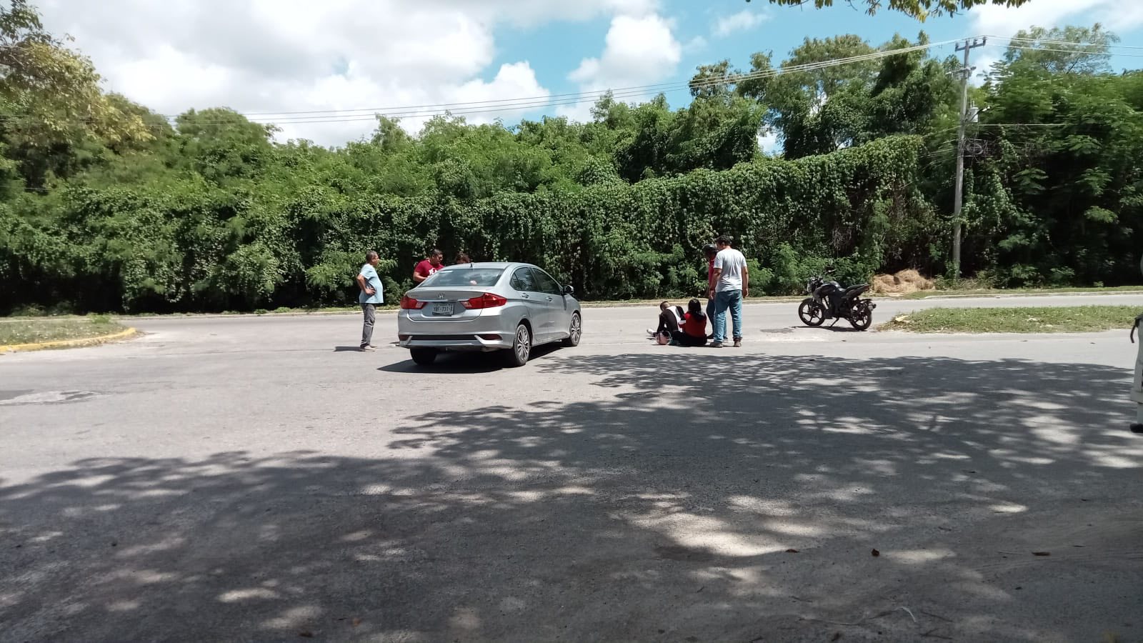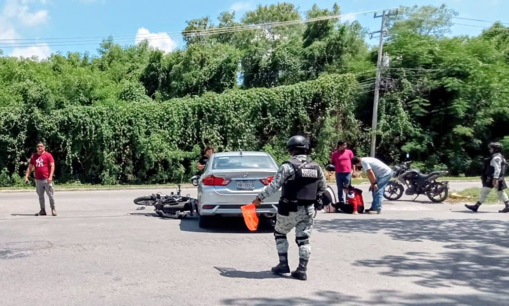 Chetumal, 3 de septiembre.- Un fuerte accidente de tránsito se registró este mediodía en el cruce de las avenidas Insurgentes y Gerona, a la entrada del fraccionamiento Marsella, cuando un vehículo particular impactó a una motocicleta, provocando que sus ocupantes resultaran lesionados.