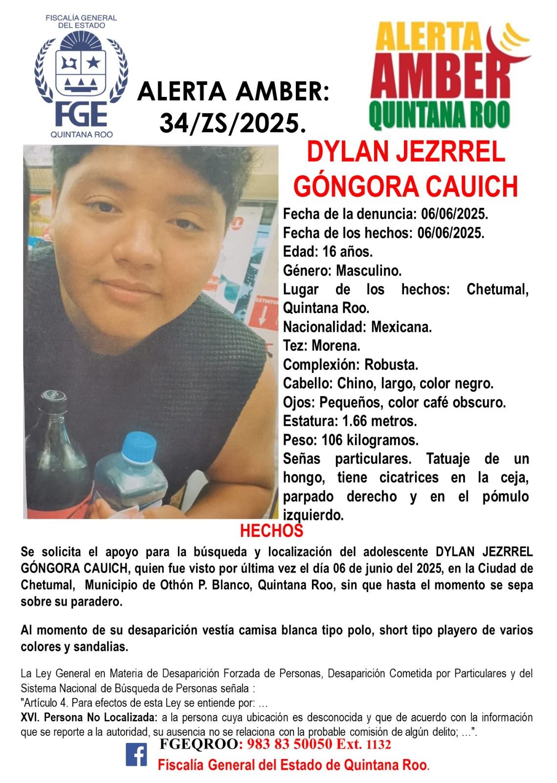 Chetumal, 7 de junio.- Las autoridades de la Fiscalía General del Estado emitieron una Alerta Amber para solicitar el apoyo ciudadano en la búsqueda del adolescente Dylan Jezrrel Góngora Cauich, de 16 años, quien fue reportado como desaparecido el pasado 6 de junio en la ciudad de Chetumal, municipio de Othón P. Blanco.