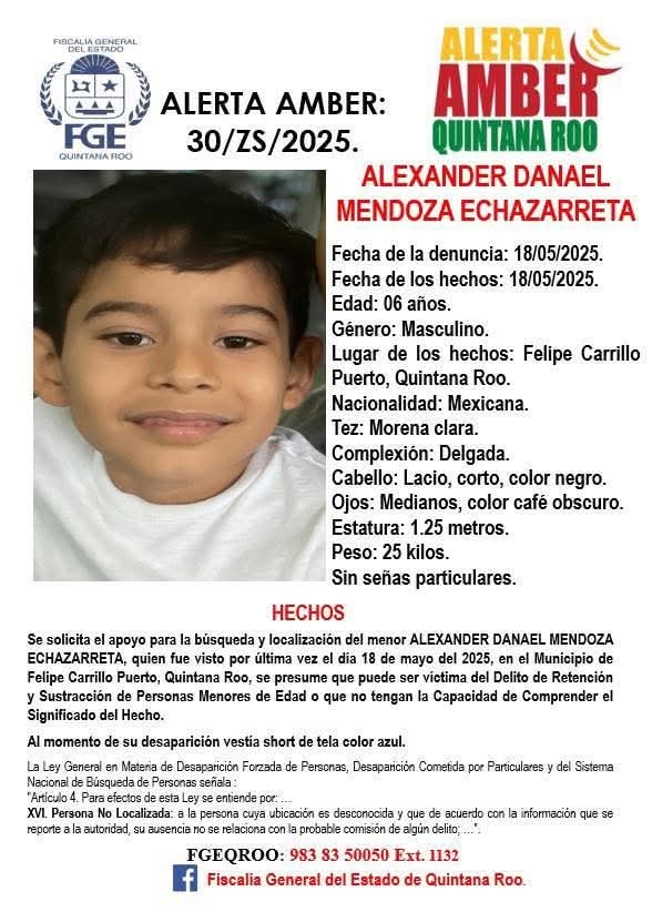 FELIPE CARRILLO PUERTO a 19 de mayo.- La Fiscalía General del Estado de Quintana Roo emitió una ficha de búsqueda y activó la Alerta Amber para localizar a Alexander Danael Mendoza Echazarreta, un menor de tan solo seis años de edad que fue reportado como desaparecido el domingo 18 de mayo de 2025. La última vez que se le vio fue en calles del municipio de Felipe Carrillo Puerto.