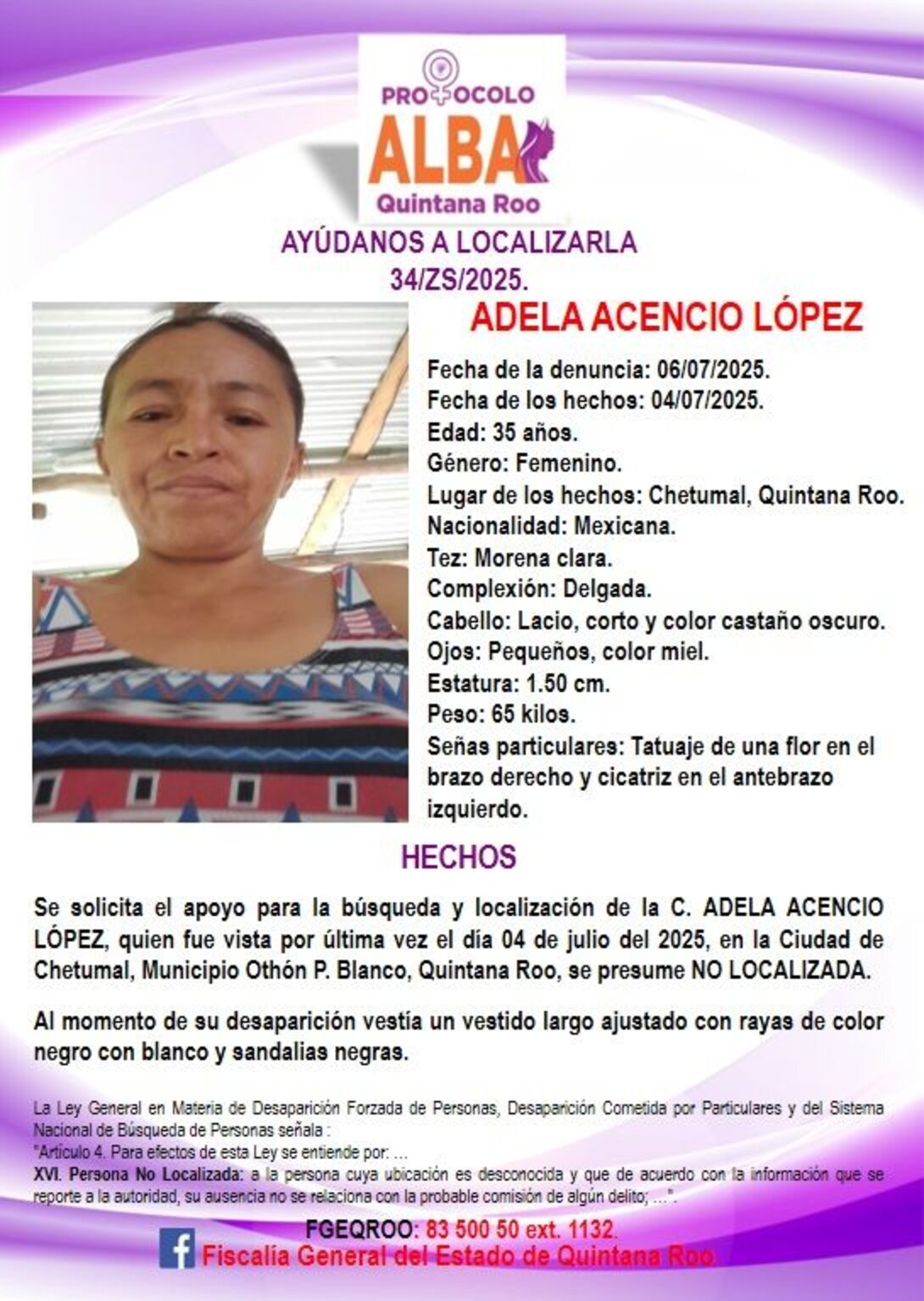 Chetumal, 6 de julio.- La Fiscalía General del Estado de Quintana Roo emitió una ficha de búsqueda para dar con el paradero de Adela Asensio López, de 35 años de edad, quien fue vista por última vez el pasado 4 de julio en la ciudad de Chetumal. La activación se realizó mediante el Protocolo Alba con el número de expediente 34/ZS/2025.