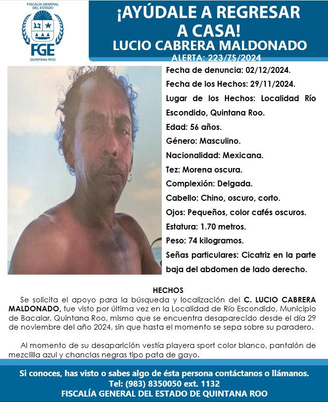 CHETUMAL, 3 de diciembre.- La Fiscalía General del Estado de Quintana Roo ha emitido una ficha de búsqueda para localizar a Lucio Cabrera Maldonado, de 56 años de edad, reportado como desaparecido desde el pasado 29 de noviembre en la comunidad de Río Escondido, municipio de Bacalar.