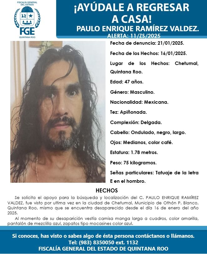 CHETUMAL, 22 de enero.- Paulo Enrique Ramírez Valdez, de 47 años, fue reportado como desaparecido en la ciudad de Chetumal. Según la ficha de búsqueda identificada como 11ZS-2025, la última vez que se le vio vestía una camisa de manga larga a cuadros amarilla, pantalón de mezclilla azul y zapatos mocasines del mismo color.