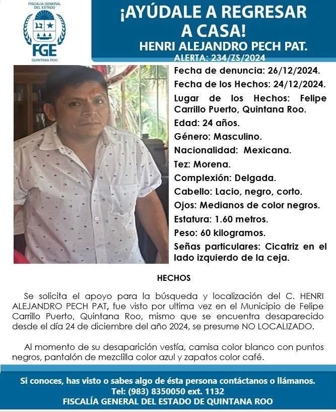 TULUM a 26 de diciembre. – La Fiscalía General del Estado (FGE) de Quintana Roo ha emitido una ficha de búsqueda para localizar a Henri Alejandro Pech Pat, un joven de 24 años reportado como desaparecido desde el pasado 24 de diciembre en el municipio de Felipe Carrillo Puerto.