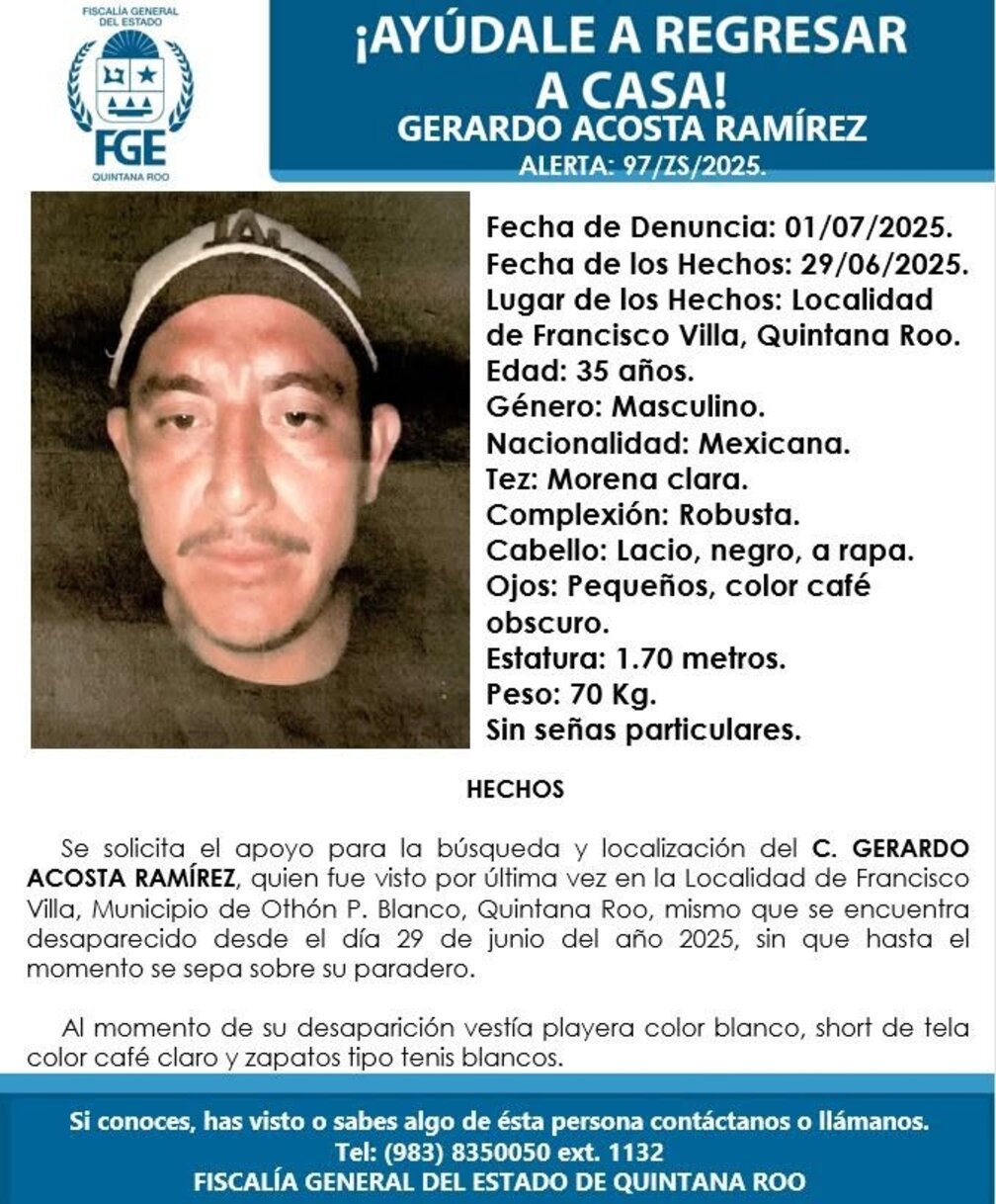 Chetumal, 2 de julio.- La Fiscalía General del Estado de Quintana Roo activó una ficha de búsqueda para dar con el paradero de Gerardo Acosta Ramírez, de 35 años de edad, quien fue reportado como desaparecido desde el pasado 29 de junio en la comunidad de Francisco Villa, municipio de Othón P. Blanco.