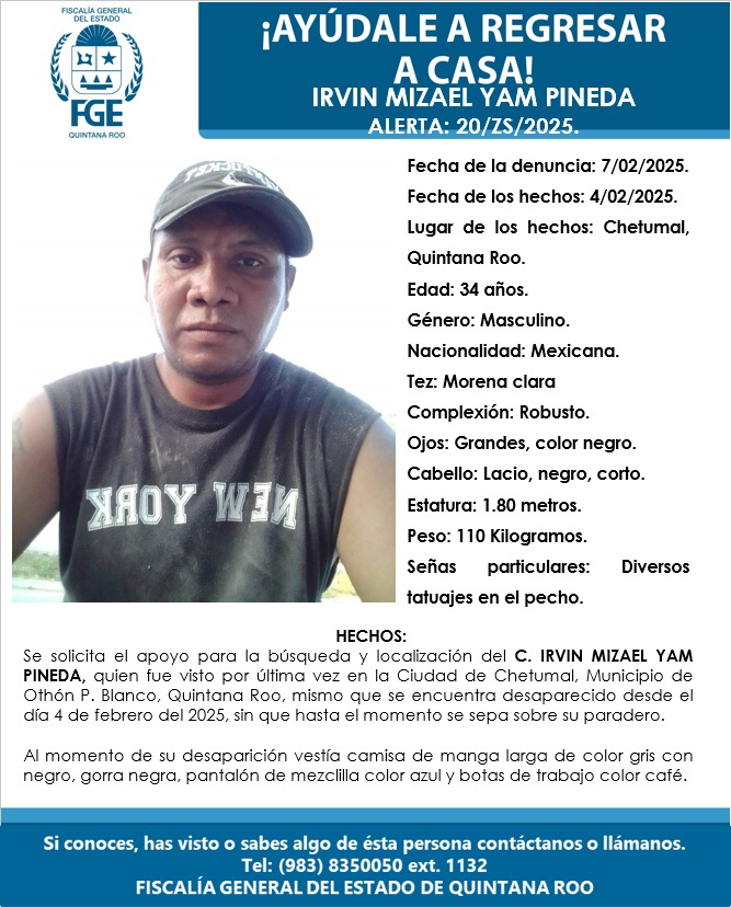 Chetumal, 8 de febrero.- La Fiscalía General del Estado de Quintana Roo emitió una ficha de búsqueda con el identificativo 20/ZS/2025 para localizar a Invin Mizael Yam Pineda, un hombre de 34 años desaparecido en la ciudad de Chetumal el pasado 4 de febrero de 2025.