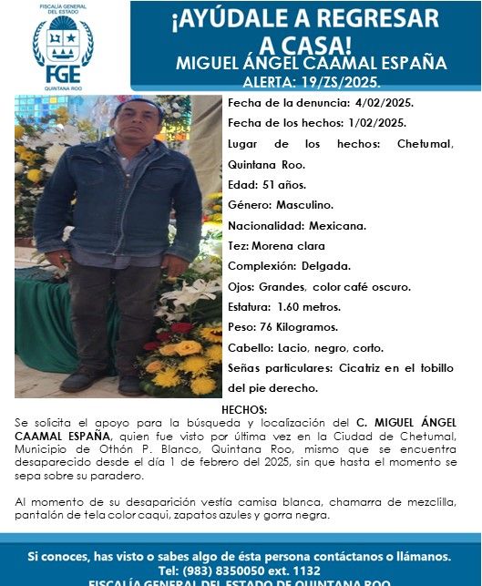 ► La Fiscalía General del Estado de Quintana Roo ha emitido una ficha de búsqueda para localizar a Miguel Ángel Caamal España, de 51 años, quien desapareció el 1 de febrero en Chetumal