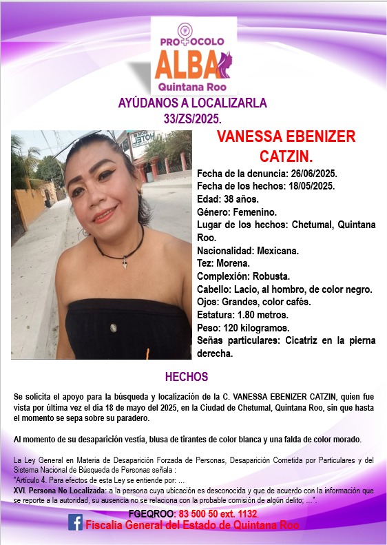 Vanessa Ebenizer Catzín desapareció en mayo en Chetumal. La Fiscalía activó el Protocolo Alba y solicita el apoyo ciudadano para localizarla. La denuncia fue interpuesta un mes después