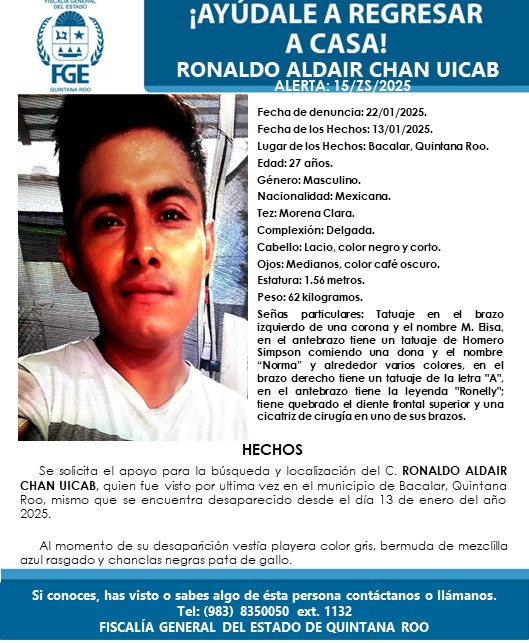 CHETUMAL, 25 de enero.- Ronaldo Aldair, de 27 años, fue visto por última vez en Bacalar, según la ficha de búsqueda 15/ZS/2025 emitida por las autoridades. Es un hombre de tez morena clara, complexión delgada, cabello lacio negro y corto, ojos medianos café oscuro, mide 1.56 metros y pesa aproximadamente 62 kilogramos.