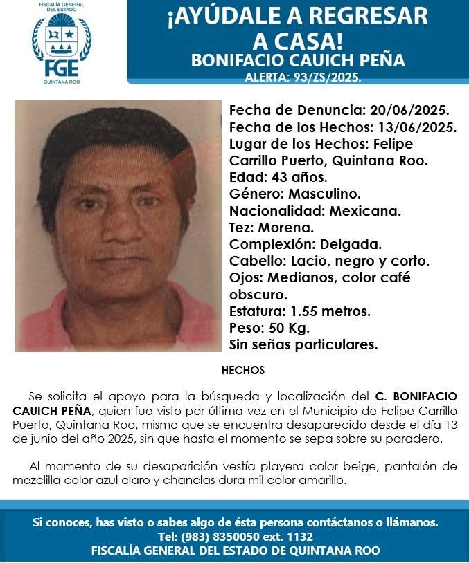 FELIPE CARRILLO PUERTO, a 20 dee junio de 2025.— La Fiscalía General del Estado de Quintana Roo activó una ficha de búsqueda con número de alerta 93/ZS/2025 para localizar a Bonifacio Cauich Peña, un hombre de 43 años de edad que fue visto por última vez el pasado 13 de junio en el municipio de Felipe Carrillo Puerto, sin que hasta el momento se tenga información sobre su paradero.
