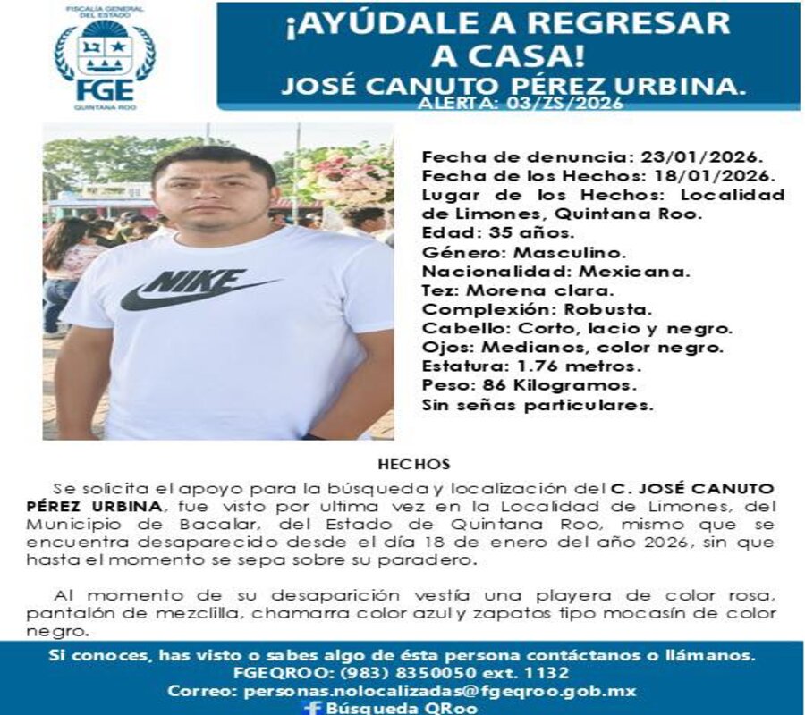 La Fiscalía de Quintana Roo solicita apoyo ciudadano para localizar a José Canuto Pérez Urbina, de 35 años, desaparecido desde el 18 de enero en Limones, municipio de Bacalar; se mantiene activa su búsqueda oficial