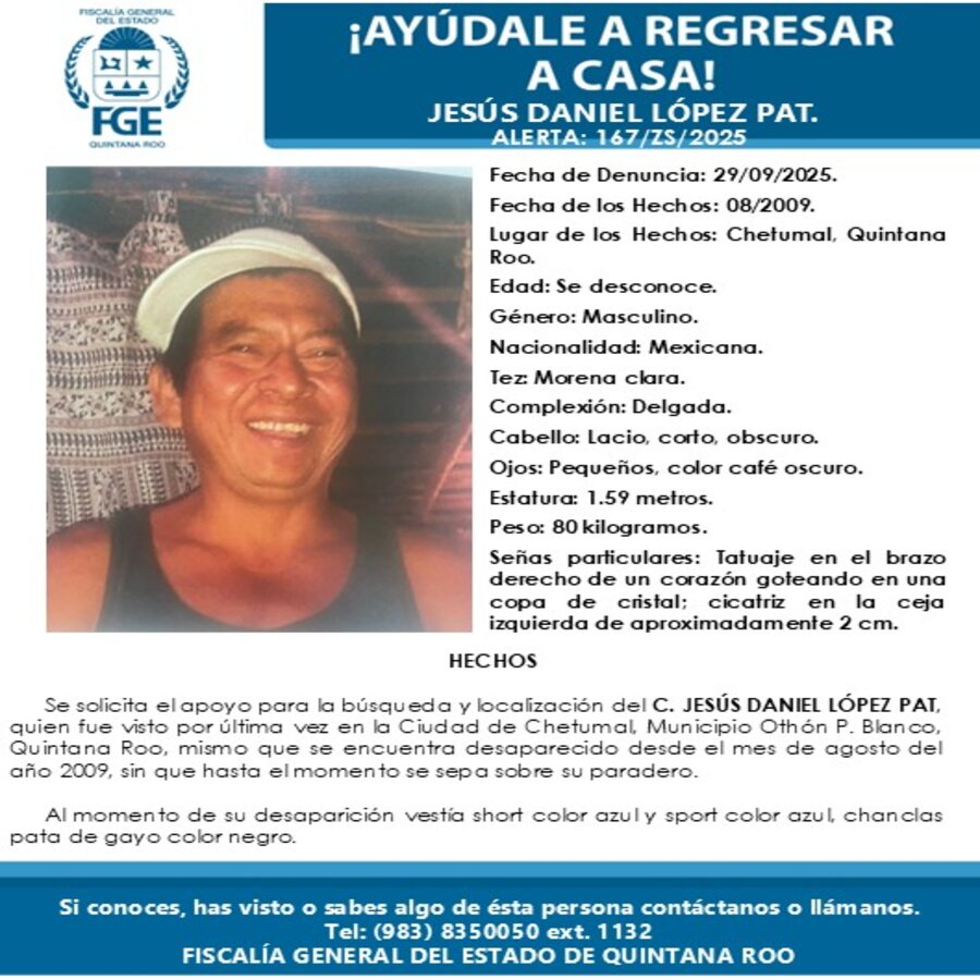 Chetumal, 30 de septiembre.- La Fiscalía General del Estado de Quintana Roo emitió una ficha de búsqueda para ubicar a Jesús Daniel López Pat, desaparecido desde agosto de 2009, tras solicitud de sus familiares.