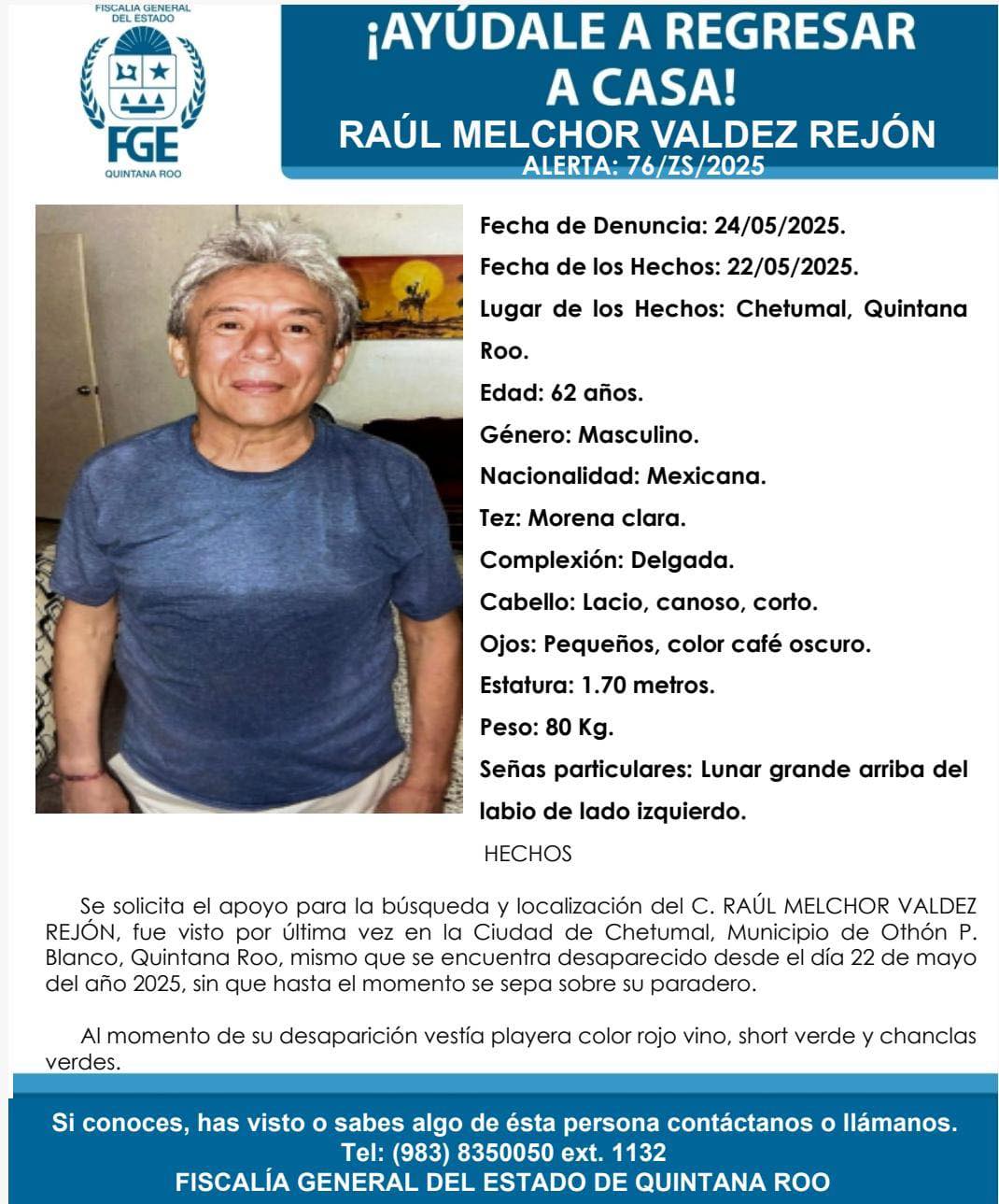 Chetumal, 26 de mayo.- La Fiscalía General del Estado de Quintana Roo emitió una alerta para solicitar el apoyo ciudadano en la búsqueda de Raúl Melchor Valdez Rejón, de 62 años de edad, quien fue reportado como desaparecido en la ciudad de Chetumal desde el pasado 22 de mayo de 2025. La denuncia correspondiente fue formalizada el 24 del mismo mes, por lo que se activó la ficha de búsqueda con número 76/ZS/2025.