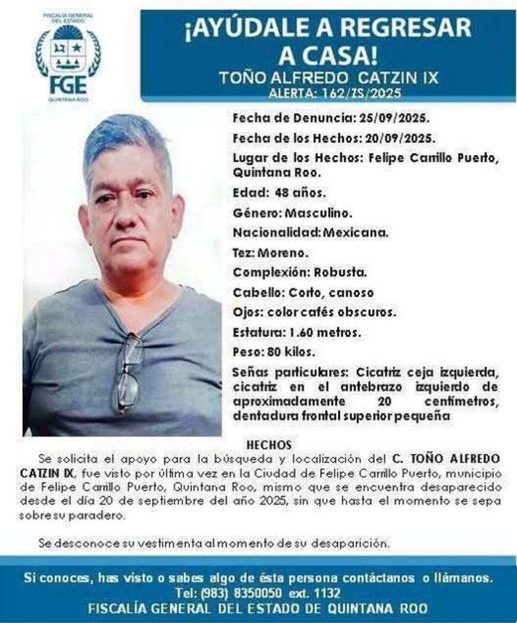 FELIPE CARRILLO PUERTO a 26 de septiembre.— La Fiscalía General del Estado de Quintana Roo activó una ficha de búsqueda para localizar a Toño Alfredo Catzin Ix, de 48 años de edad, reportado como desaparecido desde el pasado 20 de septiembre de 2025 en este municipio.