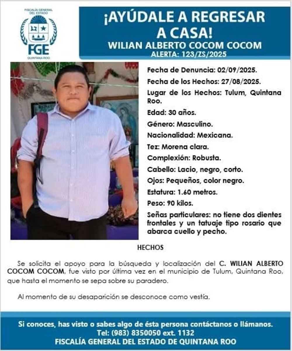 TULUM a 02 de septiembre.– La Fiscalía General del Estado de Quintana Roo (FGE) emitió una ficha de búsqueda para localizar a Wilian Alberto Cocom Cocom, de 30 años de edad, quien fue visto por última vez el pasado 27 de agosto de 2025 en el municipio de Tulum.