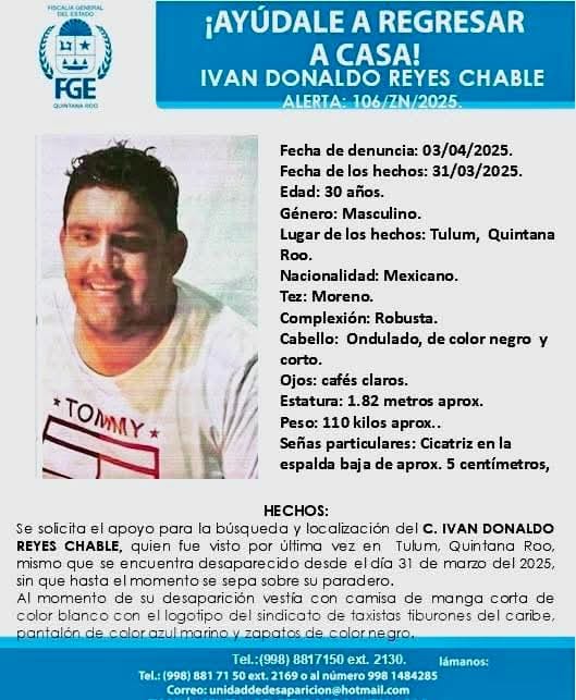 En tanto, Iván Donaldo Reyes Chablé fue reportado como desaparecido desde el 31 de marzo. Su ficha de búsqueda dada a conocer hoy, detalla que fue visto por última vez portando el uniforme característico de los taxistas de Tulum: camiseta blanca con logotipo de Tommy Hilfiger, pantalón azul marino y sandalias cruzadas de color café. El conductor mide aproximadamente 1.82 metros, pesa 110 kilogramos, y como seña particular tiene una cicatriz de cinco centímetros en la parte baja de la espalda.