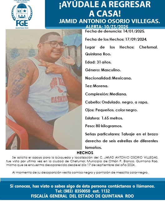 La primera ficha corresponde a Jamid Antonio Osorio Villegas, de 31 años, desaparecido desde el 17 de septiembre de 2024. Según la descripción oficial, Jamid es de tez morena, complexión mediana, cabello negro ondulado y mide 1.65 metros. Como seña particular, tiene un tatuaje de seis estrellas de diferentes tamaños en el brazo derecho. Vestía camisa y pantalón negros al momento de su desaparición. La ficha fue emitida el 14 de enero de 2025, casi cuatro meses después de su ausencia.