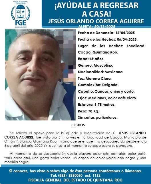 Jesús Orlando Correa Aguirre, de 49 años, fue visto por última vez el pasado 6 de abril en la localidad de Cacao. Al momento de su desaparición vestía una playera gris, pantalón color café, tenis azules, gorra y casco verde con negro, además de una mochila negra. Es de complexión delgada, tez morena clara, cabello canoso y rizado, ojos medianos color café claro, mide aproximadamente 1.75 metros y pesa cerca de 70 kilogramos.
