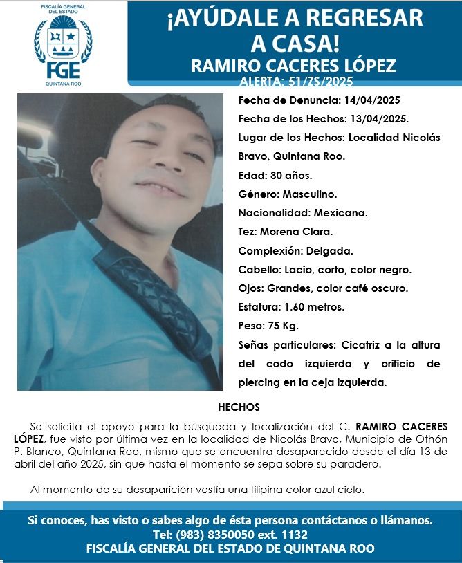 La segunda ficha corresponde a Ramiro Cáceres López, de 30 años, quien fue reportado como no localizado desde el 13 de abril en Nicolás Bravo. Entre sus características destacan una estatura de 1.60 metros, complexión delgada, tez morena clara, cabello negro lacio y corto, ojos grandes color café oscuro, y un peso aproximado de 75 kilogramos. Tiene una cicatriz en el codo izquierdo y un orificio de piercing en la ceja izquierda. Vestía una filipina azul cielo al momento de desaparecer.