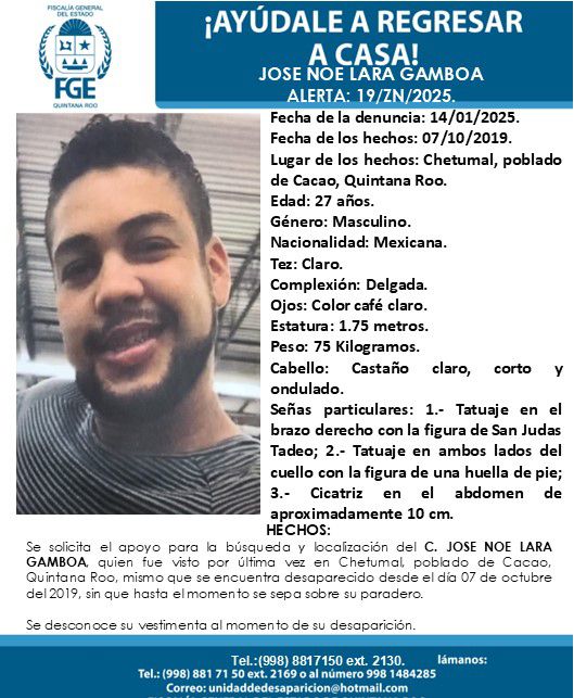 La segunda ficha es para José Noel Lara Gamboa, de 27 años, quien desapareció el 7 de octubre de 2019. Con una estatura de 1.75 metros, complexión delgada y ojos color café claro, José tiene tatuajes en el brazo derecho con la figura de San Judas Tadeo, en el cuello con la huella de un pie, y una cicatriz abdominal de 10 cm. Su vestimenta al momento de desaparecer no fue especificada.