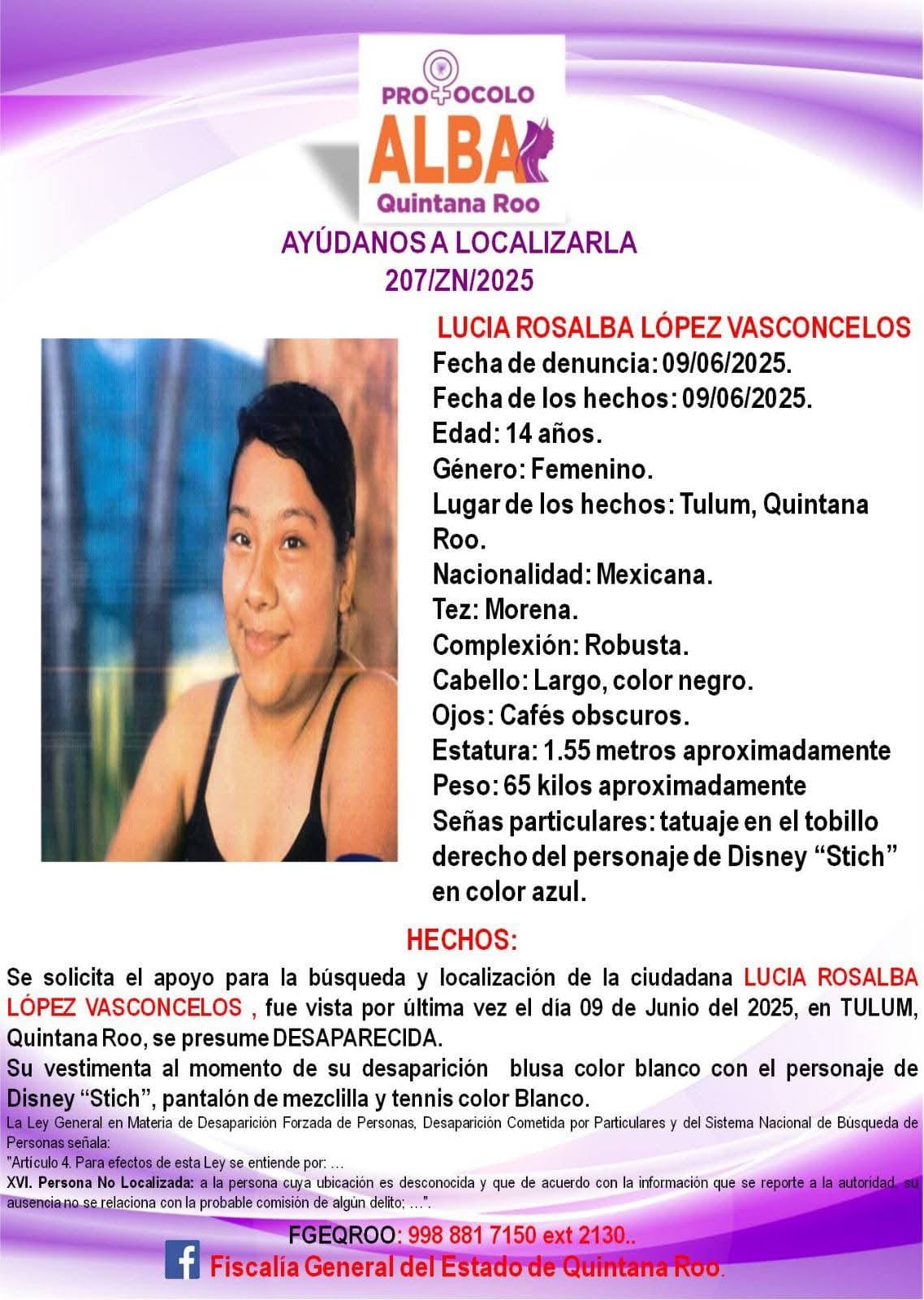 TULUM a 27 de junio.– La Fiscalía General del Estado de Quintana Roo activó una ficha de búsqueda bajo el Protocolo Alba para localizar a Lucía Rosalba López Vasconcelos, una adolescente de 14 años que fue vista por última vez el pasado 9 de junio de 2025 en el municipio de Tulum.