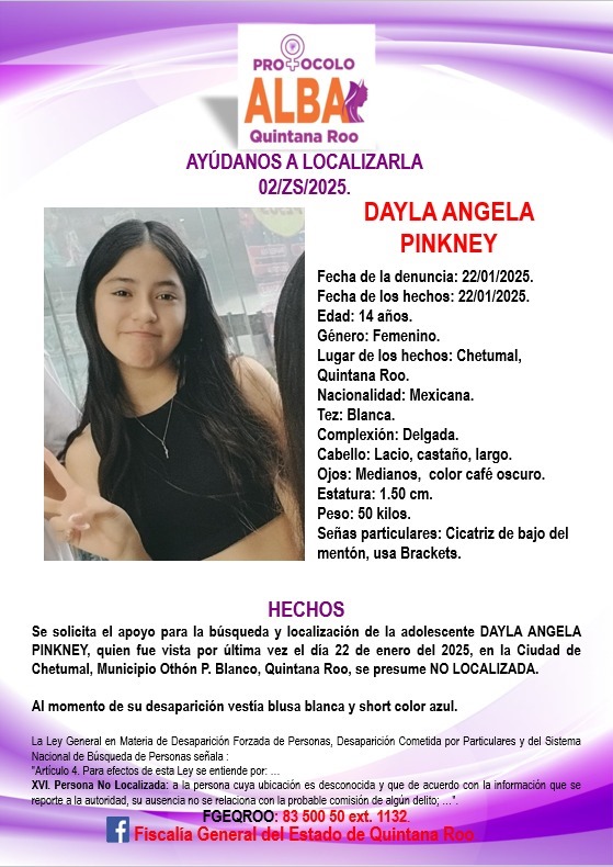CHETUMAL, 22 de enero. – La Fiscalía General del Estado de Quintana Roo activó el Protocolo Alba para localizar a Dayla Angela Pinkney, una adolescente de 14 años que fue vista por última vez hoy 22 de enero de 2025 en la ciudad de Chetumal, municipio de Othón P. Blanco. Según la ficha emitida, al momento de su desaparición, la joven vestía una blusa blanca y shorts de color azul.