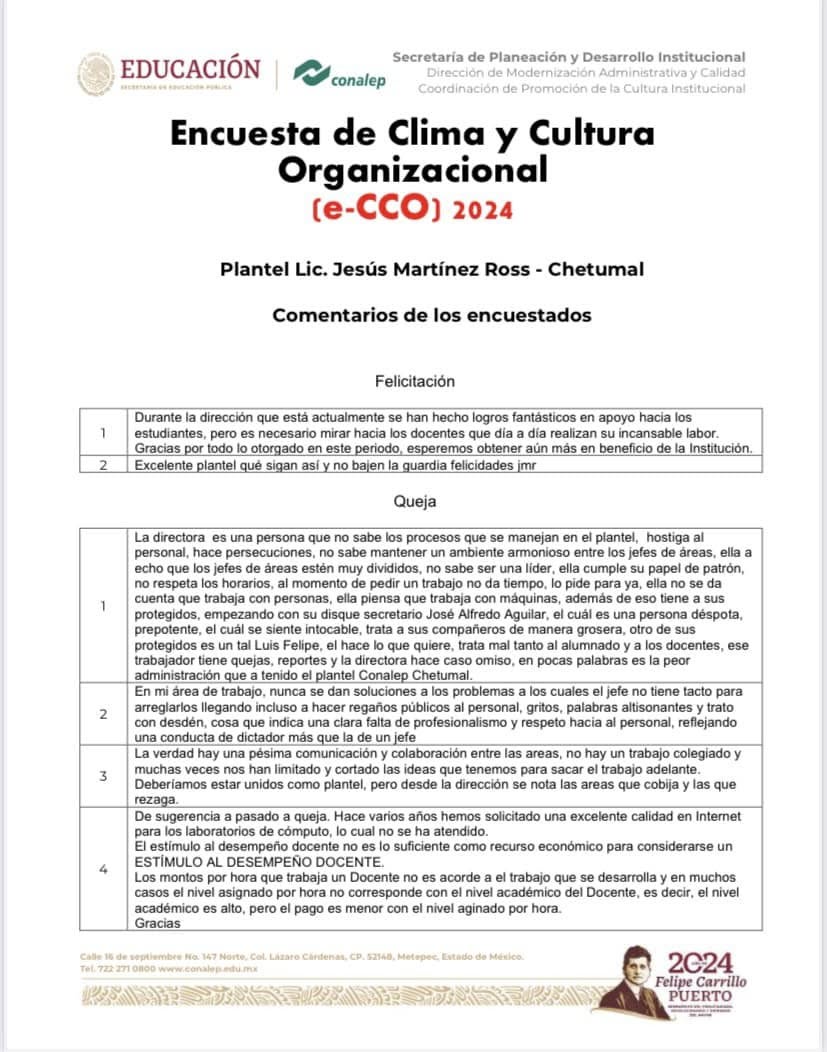 Los docentes del plantel Jesús Martínez Ross de Chetumal señalaron que prueba de estos hechos se encuentra en los resultados de la última encuesta de clima laboral, realizada en septiembre pasado, donde fueron mayores y puntuales las quejas que las felicitaciones.