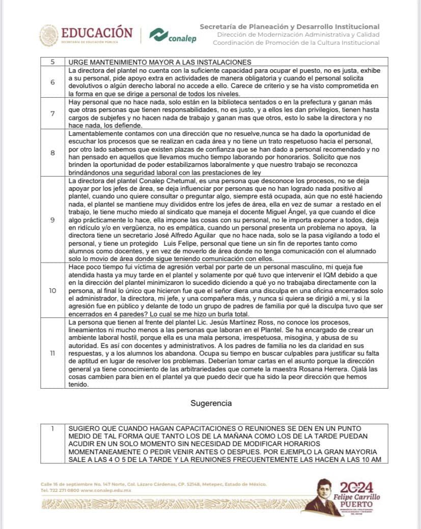 “A través de usted y su medio de comunicación, deseamos hacer un respetuoso llamado a la Gobernadora Mara Lezama y a la Secretaria de Educación, Dra. Elda Xix. Somos administrativos y docentes del CONALEP Chetumal, mujeres y hombres con vocación de servicio por la educación. Pedimos su intervención para que se remueva de su cargo a la Mtra. Rosana Herrera, recomendada del exsecretario Carlos Gorocica Moreno y, hasta hoy, directora del plantel”, dice el texto.