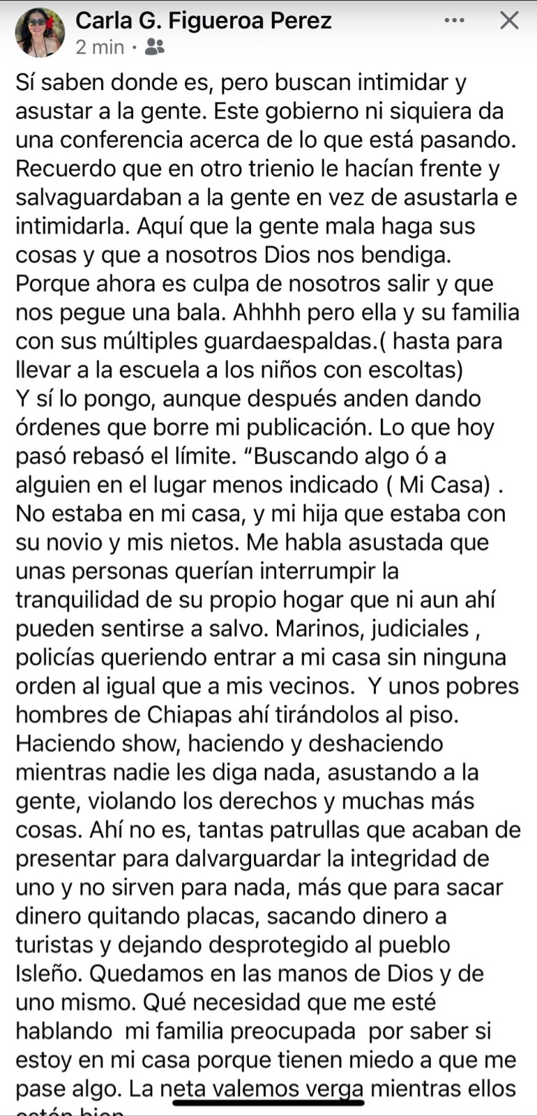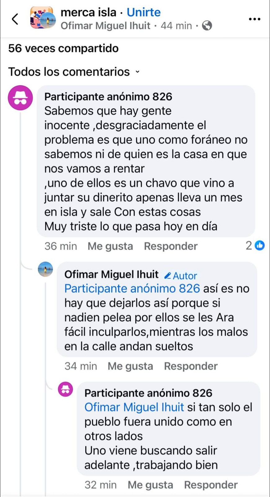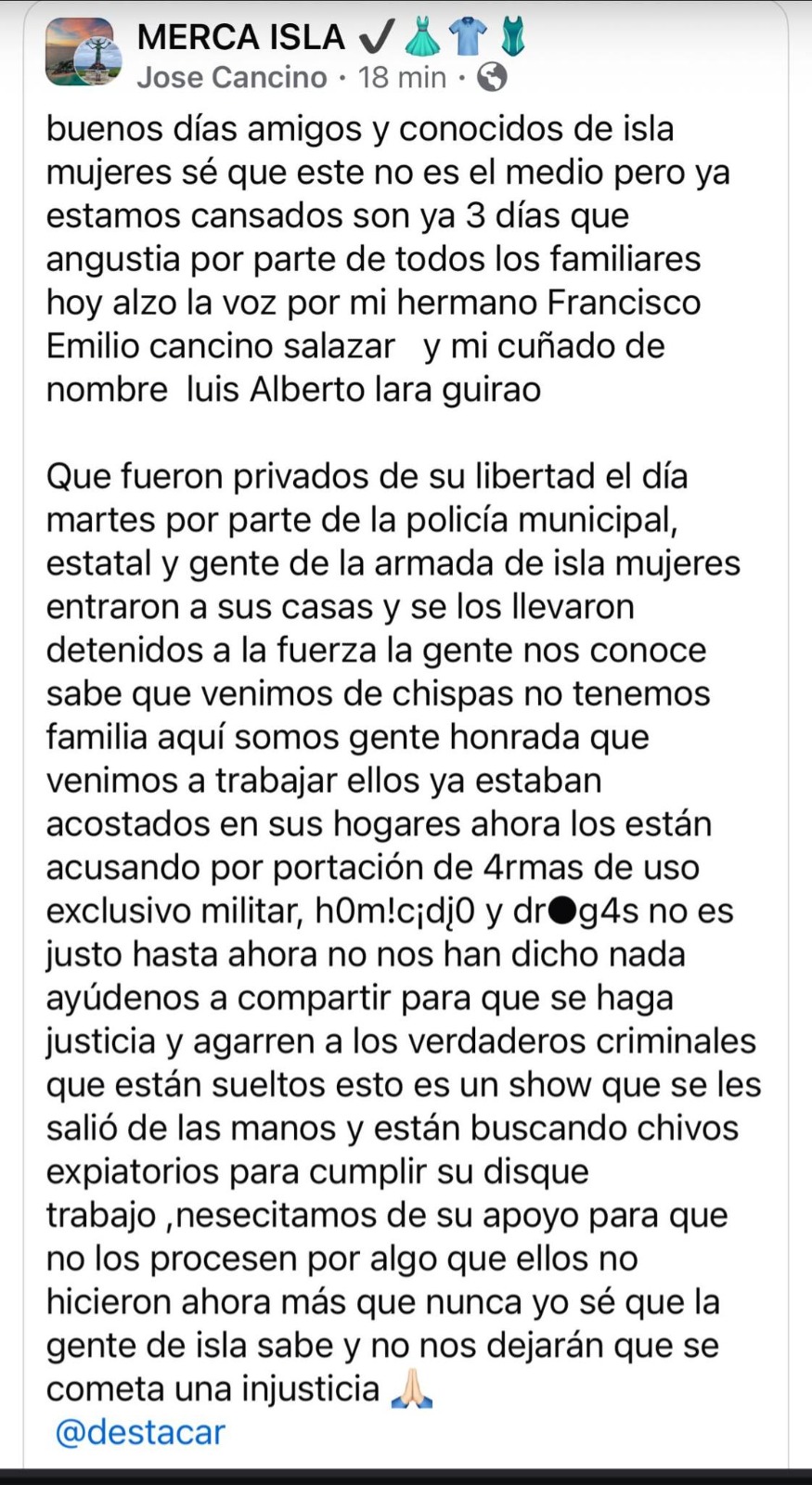 Isla Mujeres, 29 de mayo.- Una creciente ola de indignación y enojo recorre Isla Mujeres, luego de que habitantes de la ínsula utilizaran las redes sociales para denunciar detenciones arbitrarias y exigir la liberación de personas inocentes, tras la balacera registrada el pasado martes que dejó un saldo de dos personas muertas.