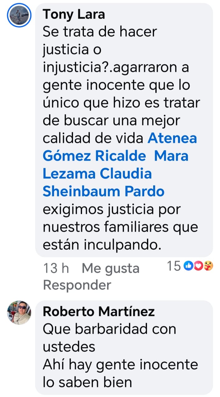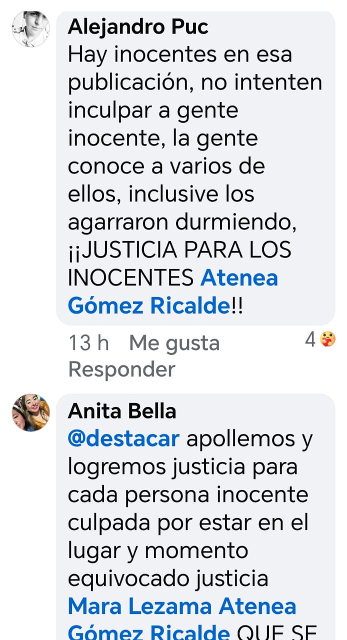 “Apoyemos y logremos justicia para cada persona inocente, culpada por estar en el lugar y momento equivocado. Justicia Mara Lezama, Atenea Gómez Ricalde”, se lee en uno de los comentarios más compartidos en Facebook.