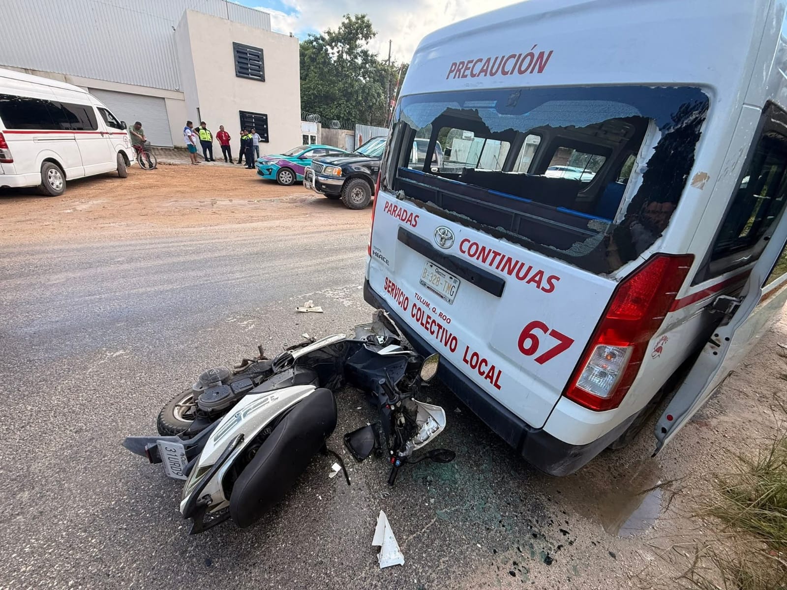 TULUM a 14 de octubre .— Una joven de 16 años resultó lesionada la tarde del lunes luego de protagonizar un aparatoso accidente en la colonia Cristal, al impactarse con su motocicleta contra la parte trasera de una combi del transporte público local.