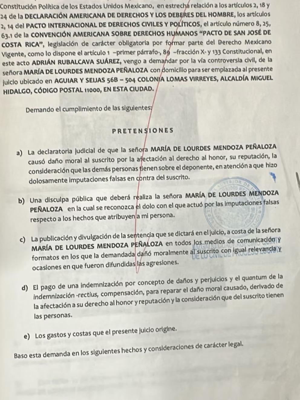 En el documento judicial correspondiente, Rubalcava solicita al juez que se declare que Mendoza le causó daño moral por haber afectado su honor, vida privada e imagen.
