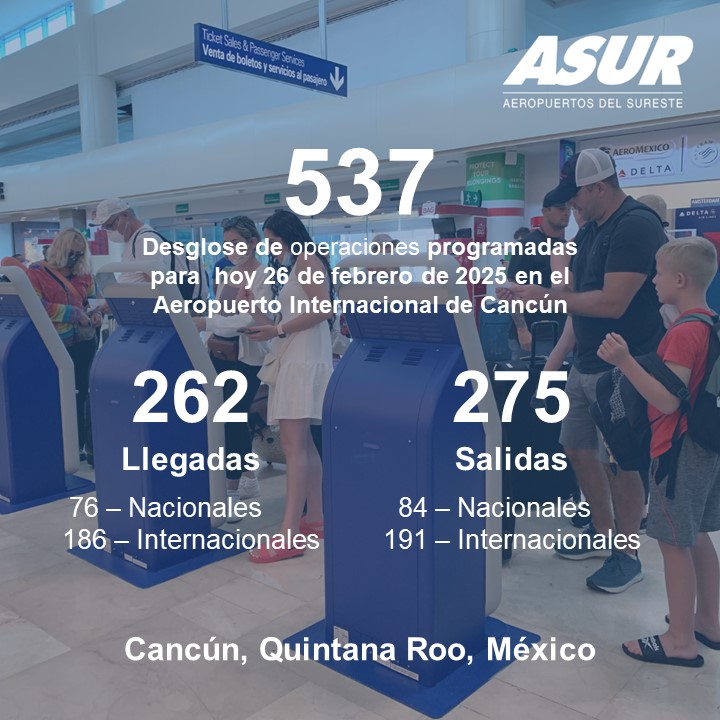 CANCÚN, Q.ROO, 26 de febrero-. El Aeropuerto Internacional de Cancún (AIC) programó para este miércoles un total de 537 operaciones en sus cuatro terminales, con un ligero incremento del 8.27% si se compara con los 496 vuelos que se contemplaron ayer.