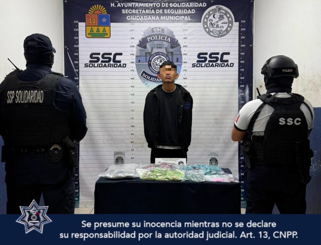 PLAYA DEL CARMEN, 26 de diciembre. –La Secretaría de Seguridad Ciudadana Municipal (SSCM) de Solidaridad detuvo a un joven con 248 envoltorios de posibles narcóticos en la colonia Centro.