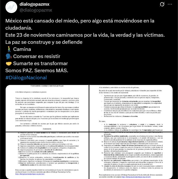 CIUDAD DE MÉXICO, 20 de noviembre.- A través del movimiento Diálogo Nacional por la Paz (DNP), también la Iglesia Católica llama ahora a realizar caminatas a nivel nacional el domingo 23 de noviembre para abordar la crisis de inseguridad, extorsión, desaparición forzada y reclutamiento criminal de menores que “domina grandes regiones” de México.