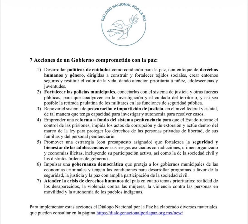 También solicitó el fortalecimiento de las policías municipales, emprender una reforma a fondo del sistema penitenciario, impulsar una gobernanza democrática y atender la crisis de derechos humanos en cuanto a los más de 133 mil desaparecidos, la violencia contra las mujeres, migrantes y personas indígenas.