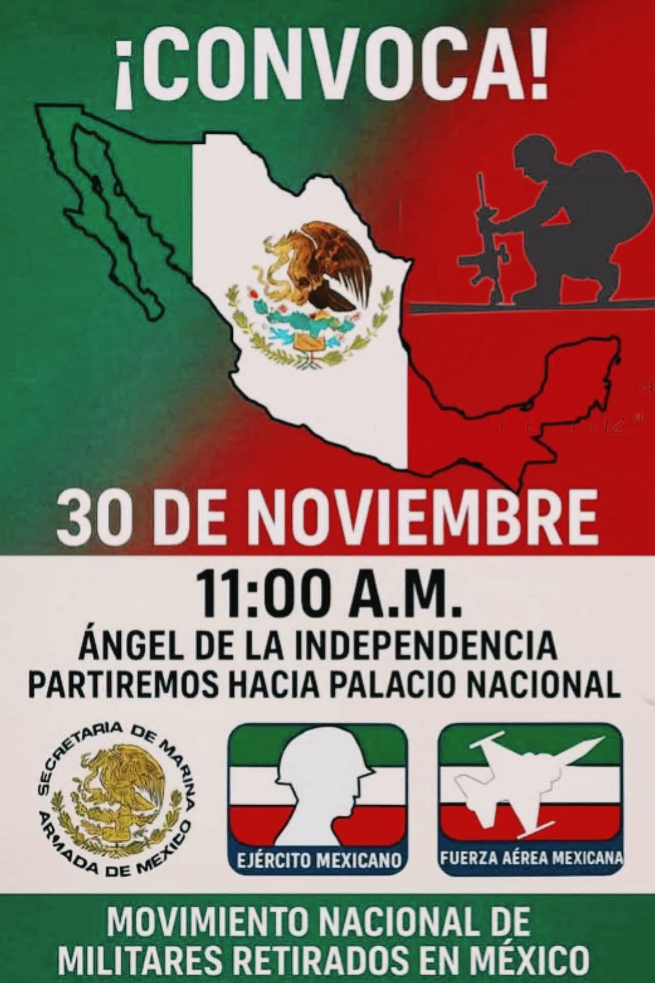 CIUDAD DE MÉXICO, 18 de noviembre.- Debido a que la presidenta de México, Claudia Sheinbaum Pardo, excluyó a sus pensiones del aumento de 4 % otorgado al personal de las Fuerzas Armadas este año, militares en retiro convocan a una marcha de protesta en la Ciudad de México, para el 30 de noviembre.