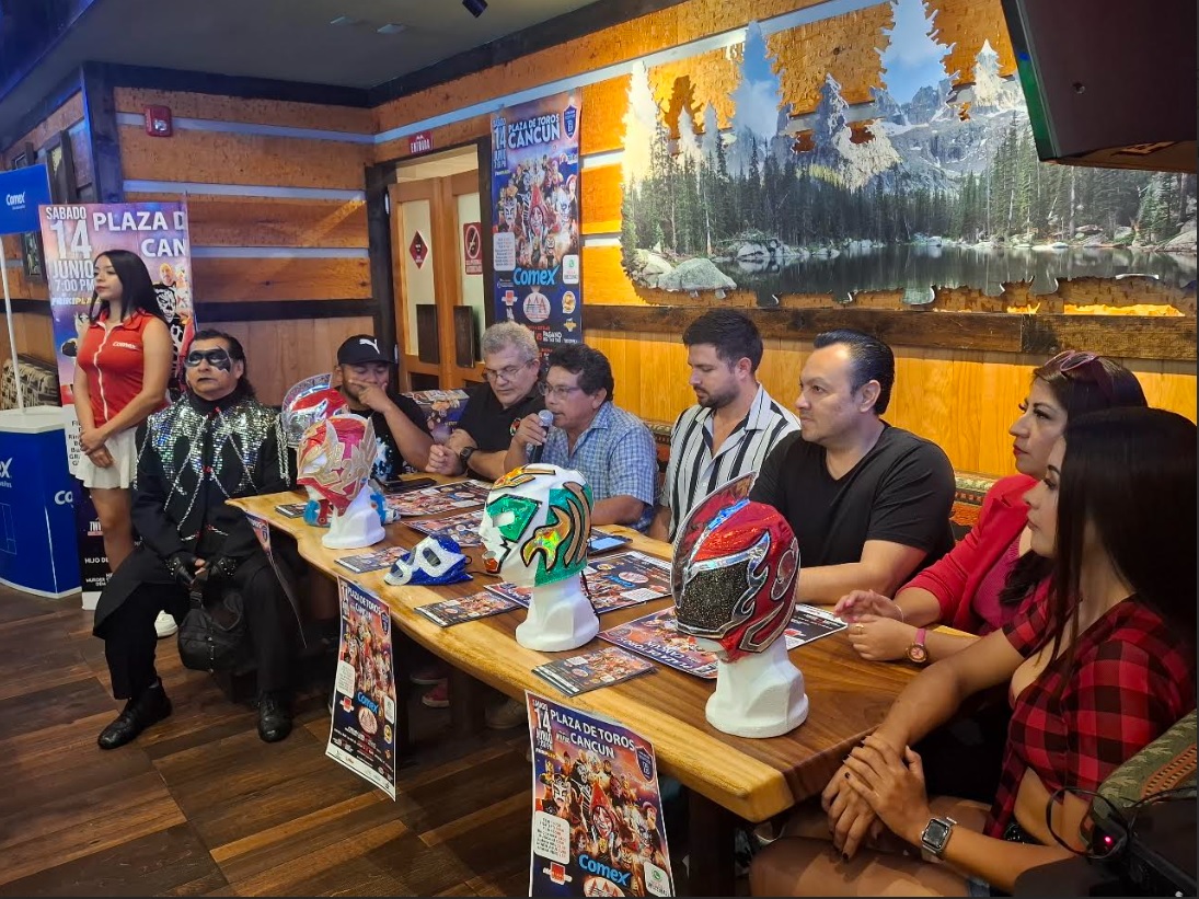 CANCÚN, Q. ROO a 26 de mayo.- Este medio día en un conocido restaurante bar deportivo de la avenida Bonampak, se llevó a cabo una rueda de prensa en la que se dio a conocer el cartel de Lucha Libre que se presentará el próximo sábado 14 de junio en punto de las 19:00 horas en la Plaza de Toros Cancún, y en el que participarán distintas figuras pertenecientes a la empresa AAA -Lucha Libre World Wide-, además de lo mejor de la baraja local.